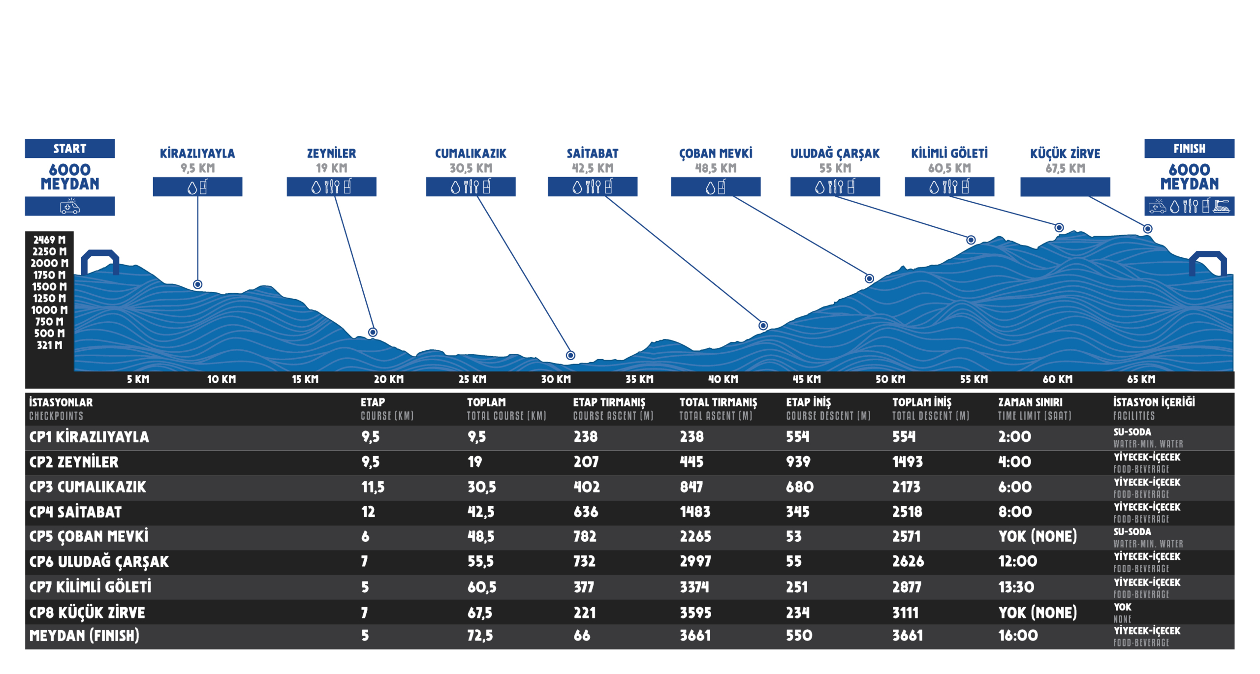 Teknik özelliği yüksek olup koşucuların performansını test edecek zorlukta bir parkurdur. 18 Temmuz Cumartesi sabahı saat 06:00‘da başlayacak yarışın start ve finish noktası oteller bölgesinde olup maksimum bitirme zamanı 16 saattir. Drop bag noktası Saitabat; ara zaman limiti 8 saattir.